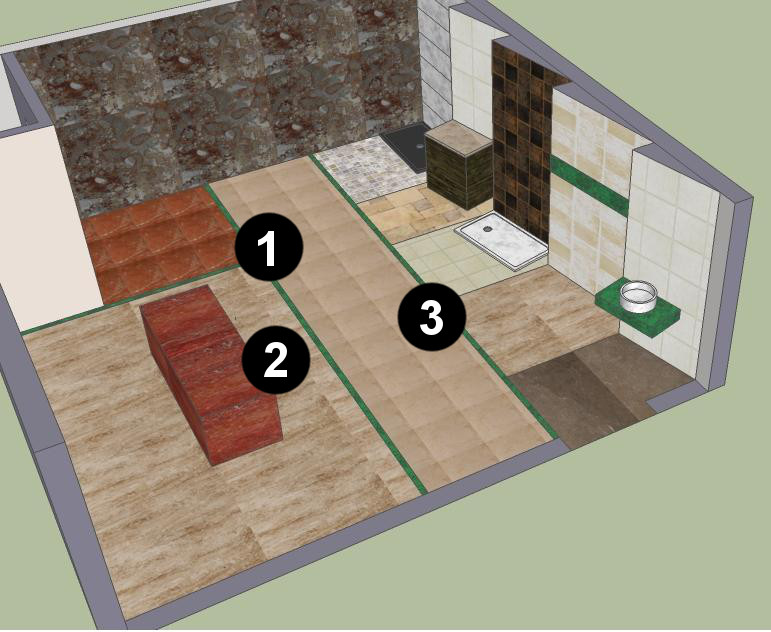 AMBIENCE: Mur Ardoise Multicolore Calibrée 40x20x1 avec protection hydrofuge et intensificateur de couleurr; AMBIANCE: Marbre Blanc Ibiza vieilli à la brosse pièce 30x30x2 avec frise centrale de 60x20x1 Ardoise Noire Calibrée et plateau de douche ardoise modèle Luna; AMBIANCE: Plaquette caliza alba vieillie pièces 40x30x2, lavabo modèle A100 couleur impérial clair et frange marron impérial avec sols rose chirivel 40x30x2; Jusqu?à la porte SDB gamme échantillons et plaquettes avec verre central accompagné de pièces Travertin Rouge, Jaune, Crème, Espagnol, chêne vieilli à pores ouverts en pièces 40x10 épaisseur 2/3cm; PLAQUETTE: Ardoise Grise calibrée à 60x30x1 hydrofugée; AMBIANCE: Calcaire CAPRI 40X40X2 et sols rouge alicante 40x30x2 vieillis à la brosse